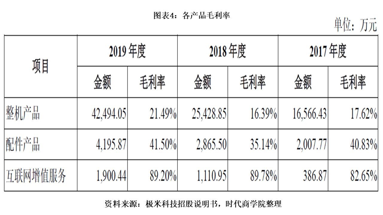 2017—2019年,极米科技主营业务毛利率分别为19.07%、17.78%和23.14%;营收贡献最大的整机产品毛利率则分别为17.62%、16.39%和21.49%。可见,年均贡献90%以上营收的整机产品,反而拖了整体毛利率的后腿。