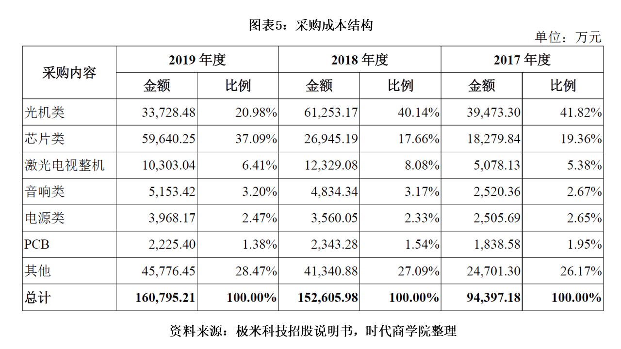 另值得关注的是,报告期内,仅光机类、芯片类两类原材料所产生的采购成本占总成本的比重就分别达61.18%、57.8%、58.07%。而光机类与芯片类皆为DMD器件及LED原材料。DMD器件对于极米科技的重要性不言而喻。