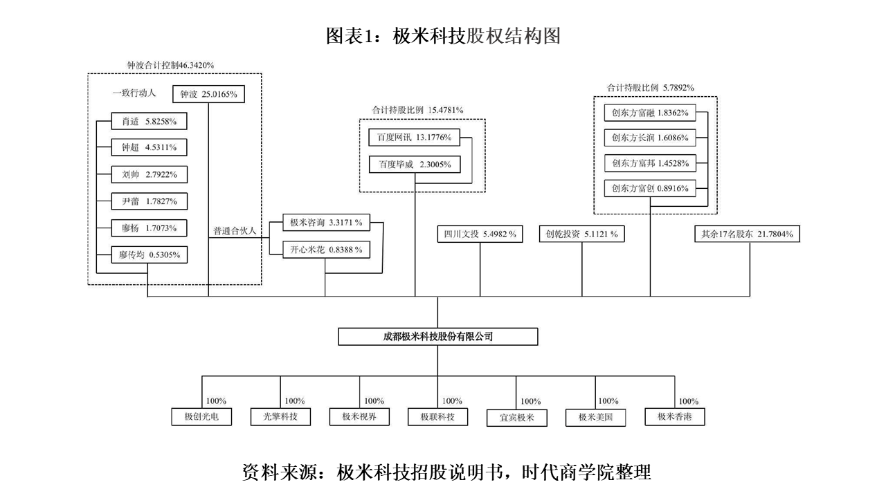 极米科技成立于2013年11月。成立之初,销售的产品主要为智能微投,股东仅8人,注册资本3万元。截至招股书(申报稿)出具日,其销售的产品及服务已涵盖智能投影产品、投影相关配件及互联网增值服务等。注册资本也增至3750万元,目前其股权结构如下: