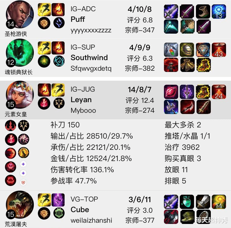 我们接着下看,其实小乐言并非单人训练,他找到了自己的好友Cube,两人承包上野携手双排。无巧不成书,在凌晨结束的一场Rank中,乐颜遇到了IG队友,迎战IG下路组合南风Puff,打野位置被抢的乐颜选出中单奇亚娜,Cube则是拿到了上单鳄鱼,而配合默契的IG下路组合锁下经典CP卢锡安和锤石。