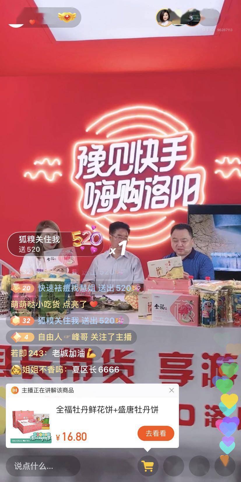 “豫见快手 嗨购洛阳”,5月20日晚,来自河南省洛阳市的栾川县县长王明朗、洛阳市老城区区长夏磊变身主播,与网友相聚在快手“享游洛阳”直播间(ID:96287113),展示、推介优质文旅产品,为家乡带货。两小时的直播中,快手平台累计在线观看人数超过400万,总点赞数超130万,带货超过11万单。