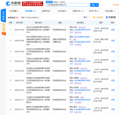 天眼查数据显示,5月20号北京完美创意科技有限公司(旗下品牌“更美”)新增一条法律诉讼信息,判决书案由为网络侵权责任纠纷,原告为演员马苏。