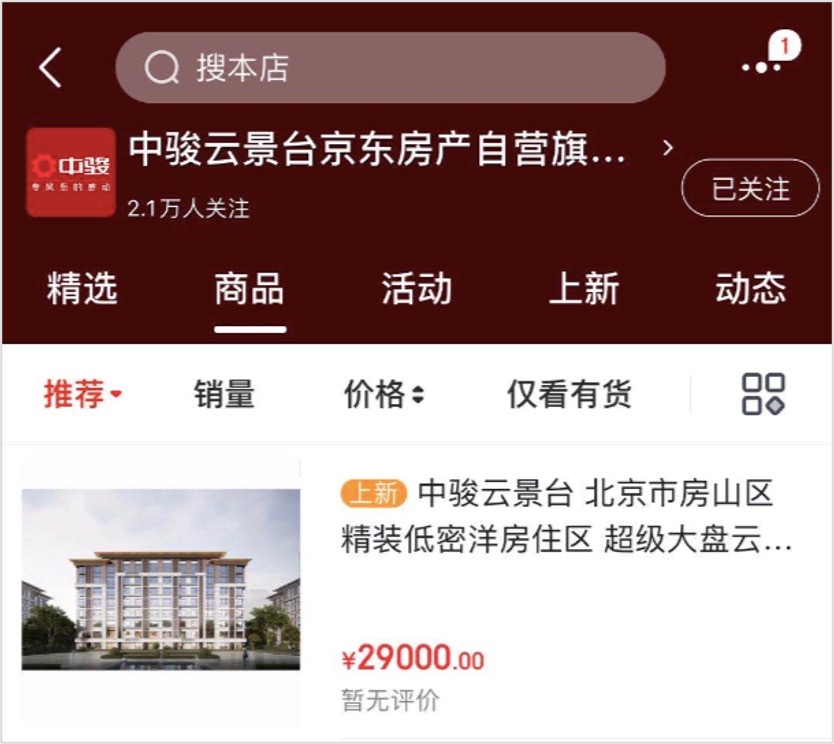 记者发现,目前在京东APP搜索“京东房产自营”,已经可以看到相关活动页面。信息显示,京东首个自营房产的合作方为中骏地产,合作项目为今年北京地区热门新盘的“中骏·云景台”。