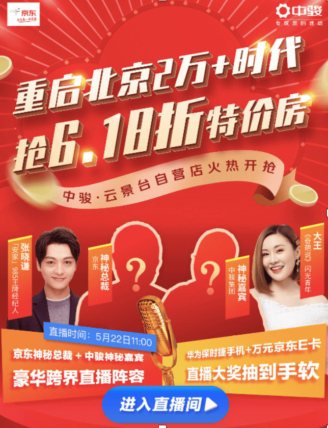 值得关注的是,中国内地男演员张晓谦、奇葩说选手大王、以及京东和中骏的两位“神秘嘉宾”还将在5月22日上午11点带来直播,在线预售全新房源,并将一套6.18折的特价房开展618抽奖活动,优惠后仅需一百多万元即可拿下一套北京新房。