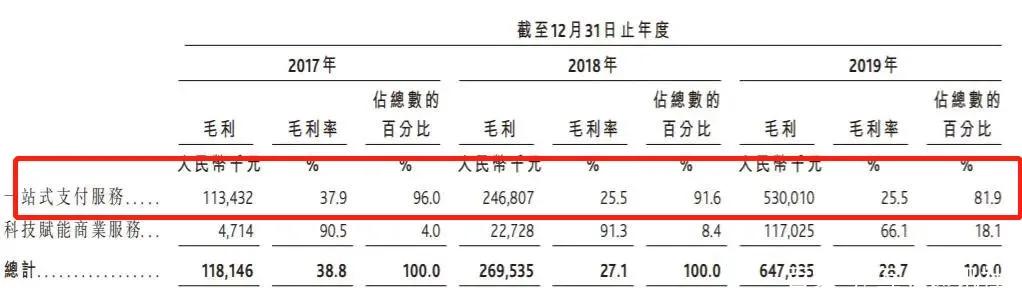 从最新招股书来看,2019年,移卡科技的一站式支付服务收入为20.81亿元,为公司贡献了92.2%的收入,但是92.2%的营收并未能撑起公司的盈利能力。