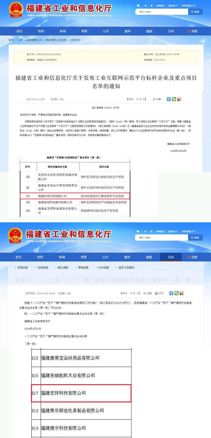 2020年宏祥科技再传捷报,荣获福建省工信厅授予的福建省增产增效制造业首批重点支持企业、福建省第一批“互联网+先进制造业”重点项目等荣誉称号! 受到了各级政府及有关部门领导的认可和支持。