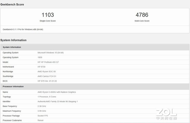 在Geekbench 5测试标准中,AMD Ryzen 5 4500U处理器单核得分1103分,多核得分4786分,再次证明了惠普战66 三代 AMD版在性能调校上的功力。