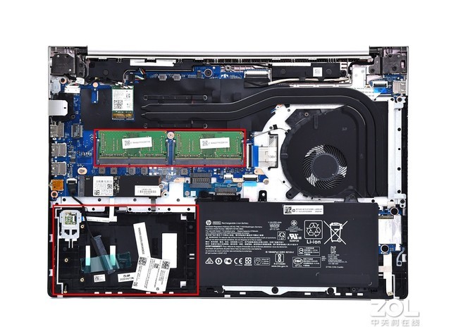 此外,我们还对惠普战66 三代 AMD版进行了简单拆解。可以看到这款机器支持双内存,双硬盘扩展,在电池左侧预留了2.5英寸硬盘位,方便用户进一步提升整机性能。