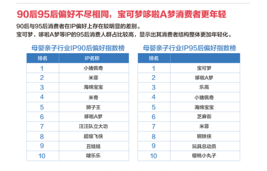 报告首次将全球亲子类IP做了“同台展示”。在2019年,经典品牌形象依然表现强势,如迪士尼IP家族在“销售指数榜”上占据统治地位,经典IP米奇,更是同时在玩具、童装、婴童用品等多个类目上名列前茅,同时也更受女性青睐;而男性消费者偏爱的乐高,仅凭玩具一个类目的优势就荣登年度总榜冠军。此外,Hello Kitty凭借强大的用户粘性,登上“忠诚指数榜”的首位;年轻的“95后”人群,也更偏好宝可梦、哆啦A梦等成熟IP。