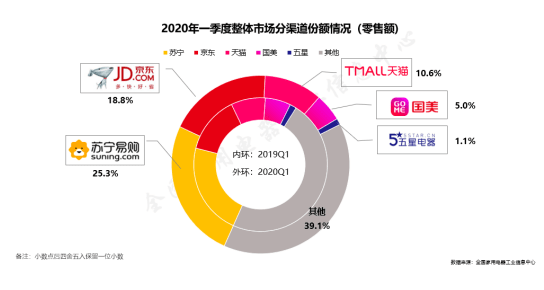 全国家用电器工业信息中心数据显示,2020年一季度,苏宁易购依靠自己的线上线下全场景覆盖模式,获得25.3%的市场份额,位居众渠道首位。
