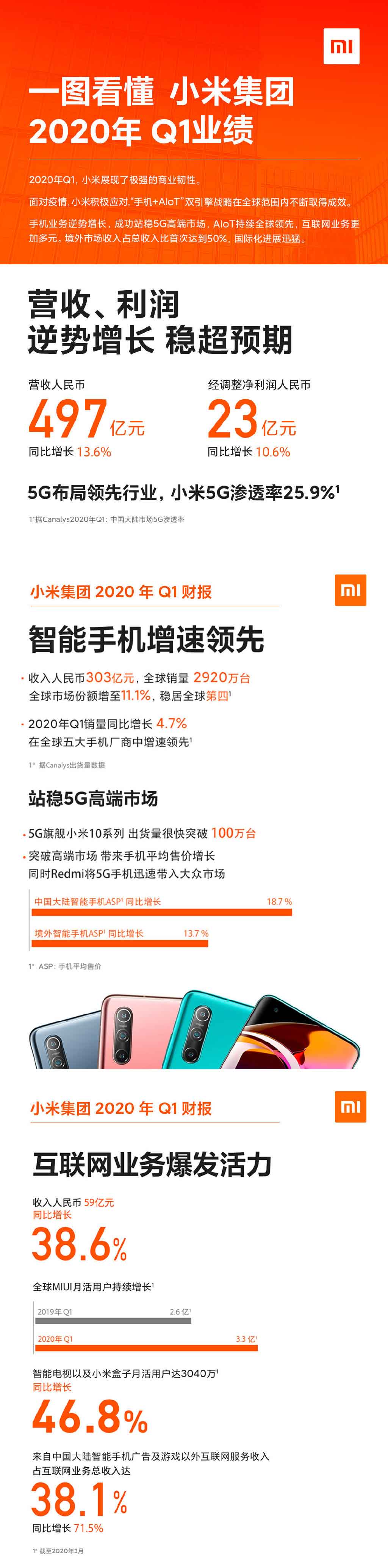 5月20日,小米集团公布2020年第一季度财报。财报显示,一季度小米总收入达到497亿元,同比增长13.6%,环比减少12%;经调整净利润23亿元,同比增长10.6%,环比减少1.9%。