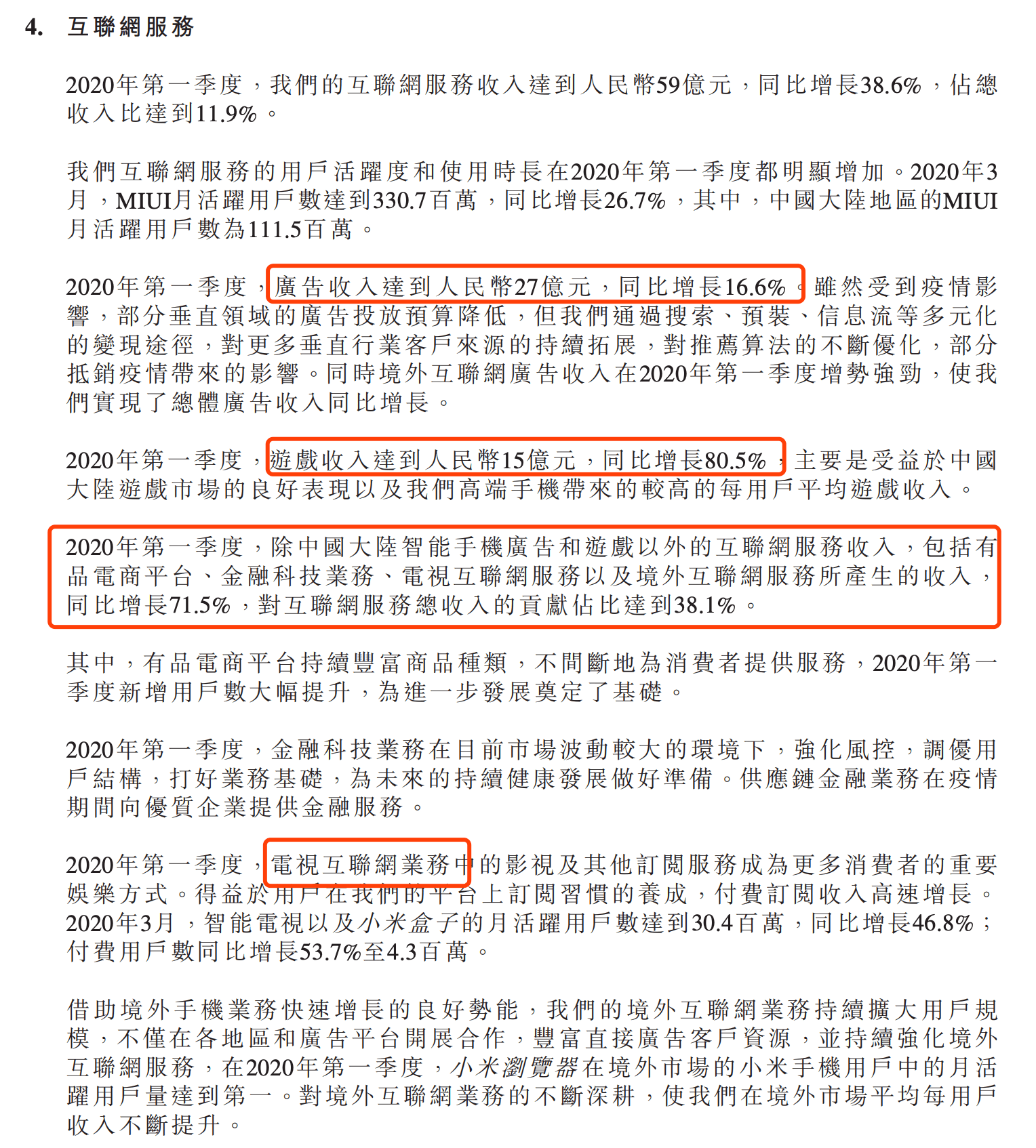 在互联网业务上,由于疫情造成的出行不便,用户居家时间较长,报告期内小米互联网服务的用户活跃度和使用时长都明显增加。3月,MIUI月活跃用户达到3.3亿人,同比增长26.7%;小米互联网广告业务逆势同比增长16.6%;新兴业务即除中国大陆广告及游戏以外的互联网服务收入,包括电视互联网服务、有品电商平台、金融科技业务和境外互联网服务,收入同比增长71.5%。
