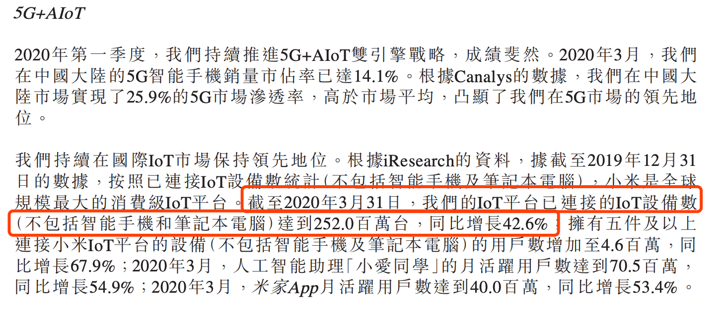 在AIoT业务上,截至今年3月31日,在不包含智能手机和笔记本电脑的情况下,小米IoT平台已连接的IoT设备数达到2.52亿台,同比增长42.6%;拥有5件及以上小米IoT设备的用户数增加至460万,同比增长67.9%;3月,“小爱同学”月活跃用户数达7050万,同比增长54.9%。