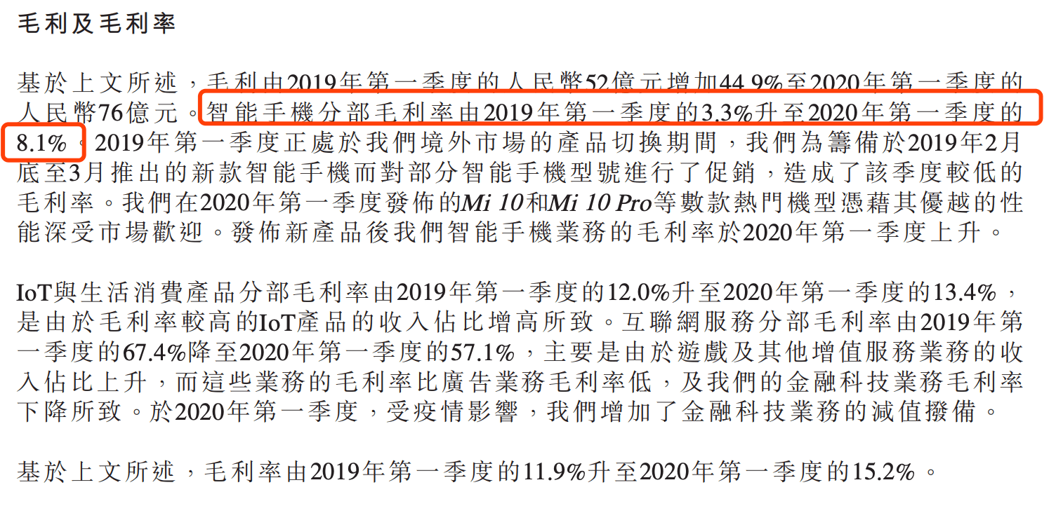 目前,小米手机业务库存健康,盈利水平稳定,智能手机的毛利率,从2019年Q1的3.3%增长至2020年Q1的8.1%。