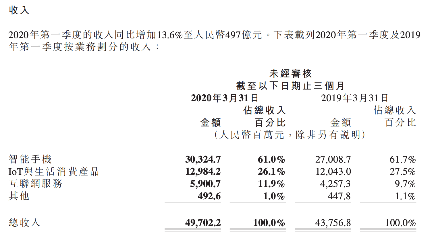在手机业务上,受疫情影响全球手机厂商销售压力徒增,一季度小米手机的表现相对稳健,收入达303亿元,同比增长12.3%,销量达到2920万部,同比增长4.7%。