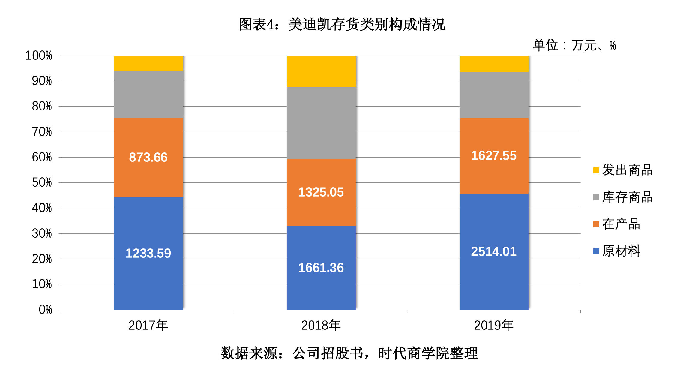 据披露信息,美迪凯2017—2019年的存货账面余额分别为2787.88万元、5028.23万元、5493.48万元。其中,原材料和在产品合计占当期存货账面余额的比重分别为75.59%、59.39%、75.39%。