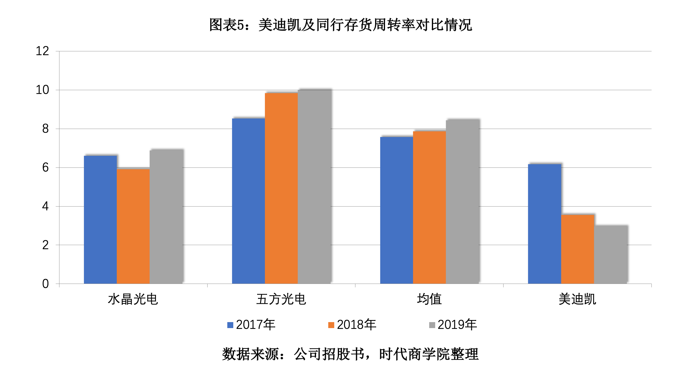 时代商学院翻阅资料后得到了否定的答案。报告期内,美迪凯存货周转率分别为6.18、3.56、2.96,呈持续下滑态势。同期,行业均值分别为7.57、7.87、8.44,逐年稳步增长。简单计算发现,2019年美迪凯的存货周转率仅为同行的1/3。
