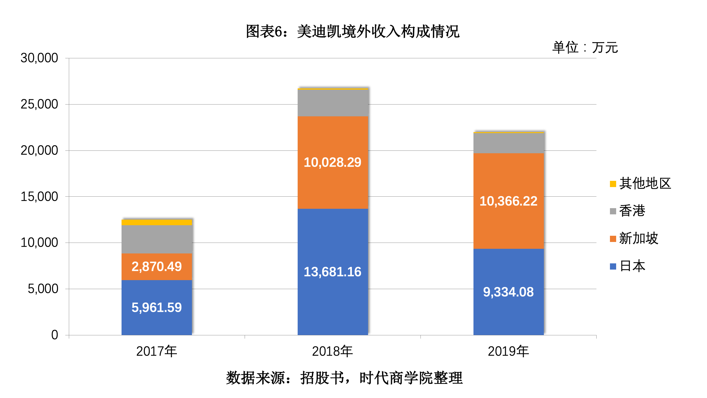 值得关注的是,美迪凯的营业收入超7成来自境外,2017—2019年境外收入占比分别为61.1%、79.95%、72.63%。其中,以新加坡和日本为主。报告期内,该公司来自上述两个地区的销售总额分别为8832.08万元、2.37亿元、1.97亿元,合计占当期境外营业收入的比例分别为70.63%、88.77%、89.63%。