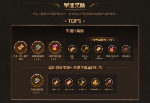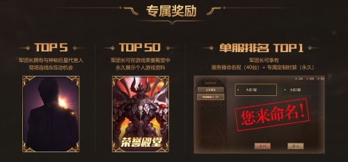 4、榜单前5名军团长可以获得和神秘巨星连线互动的机会,第一名军团长甚至可以获得专属的服务器命名权,让整个服务器都传唱你的名字!前200名军团长可以获得超值豪礼。
