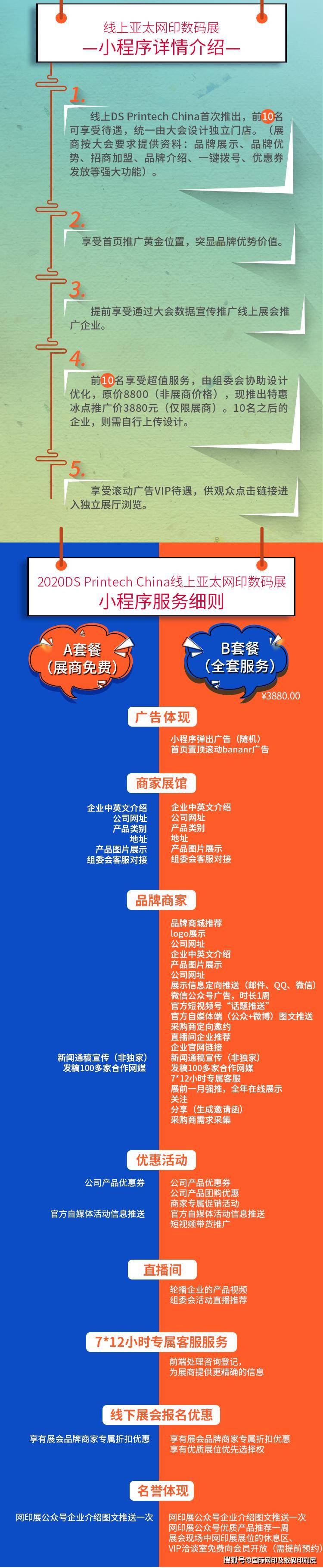 在互联网商业信息高度集中的时代,适应社交媒体商业信息共享的原则,用移动互联网方式服务本地人群,带动全国的商业媒体共同参与,最终实现行业价值。用户无需下载,只要通过扫描小程序码或搜索“线上亚太网印数码展”即可进入小程序体验相关服务。小程序还设置了观众登记、活动日程、展览内容、馆内指引等模块,展会内容和日程安排一目了然,逛展的你再也不用担心错过精彩的内容和优质的服务了。