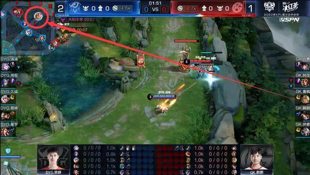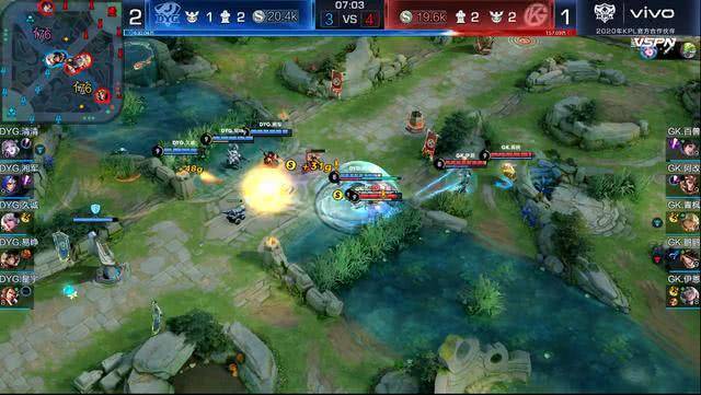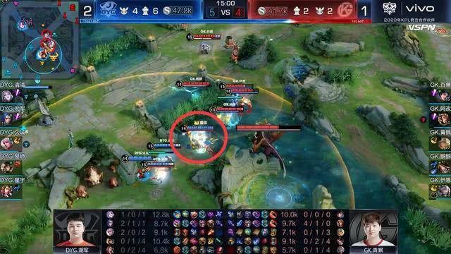 DYG本局吸取了教训,除露娜外其他四人抱团非常紧密,他们不需要打到底,他们只需要保证守约安全,能推就推,不能推就撤,慢慢找机会即可。这样一来GK无从下手,只能后撤,撤退途中GK阵型较为松散,DYG反而把握住机会,抓到GK落单马可波罗,顺势推掉GK二塔,一举打开局面。