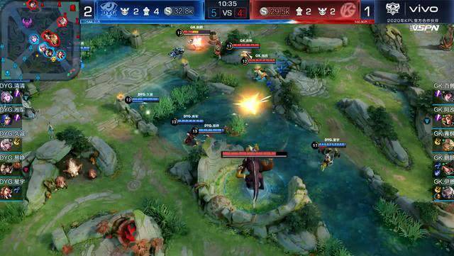 之后2分半的团战双方打成55开,DYG先是仗着人多压进GK蓝野区,但GK凭借着张良和杨戬的输出击杀2人,随后DYG靠着守约和蒙犽的火力压制,也换到2个击杀。可以看出DYG并没有想在前期和GK决战,他们想的是利用线上强势掠夺一些资源,让几条路更好的发育,累计中期决战的资本。