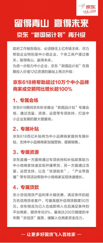 为进一步助力中小企业,京东“新国品计划”在首期投入价值12亿资源的基础上再次升级:京东618将帮助超过10万个中小品牌商家成交额同比增长超100%。