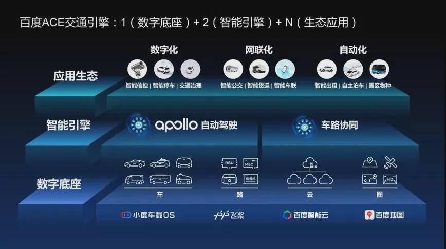 其中,一大数字底座指“车”、“路”、“云”、“图”等数字交通基础设施,包括小度车载OS、飞桨、百度智能云、百度地图;两大智能引擎分别是Apollo自动驾驶引擎和车路协同引擎;N大应用生态,包括智能信控、智能停车、交通治理、智能公交、智能货运、智能车联、智能出租、自主泊车和园区物种等。
