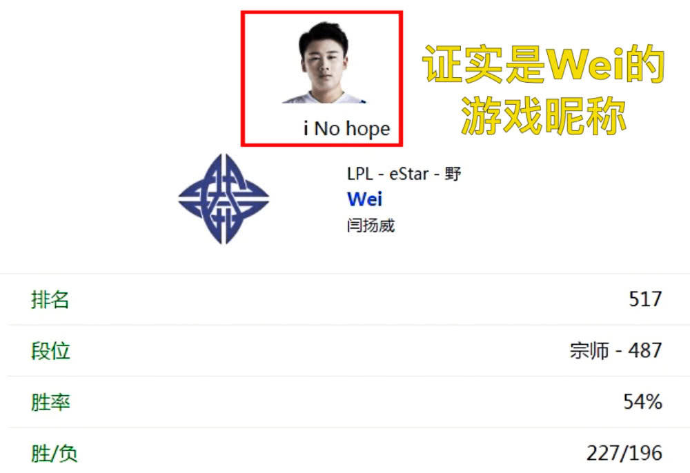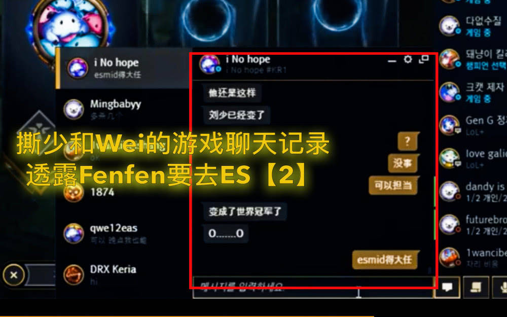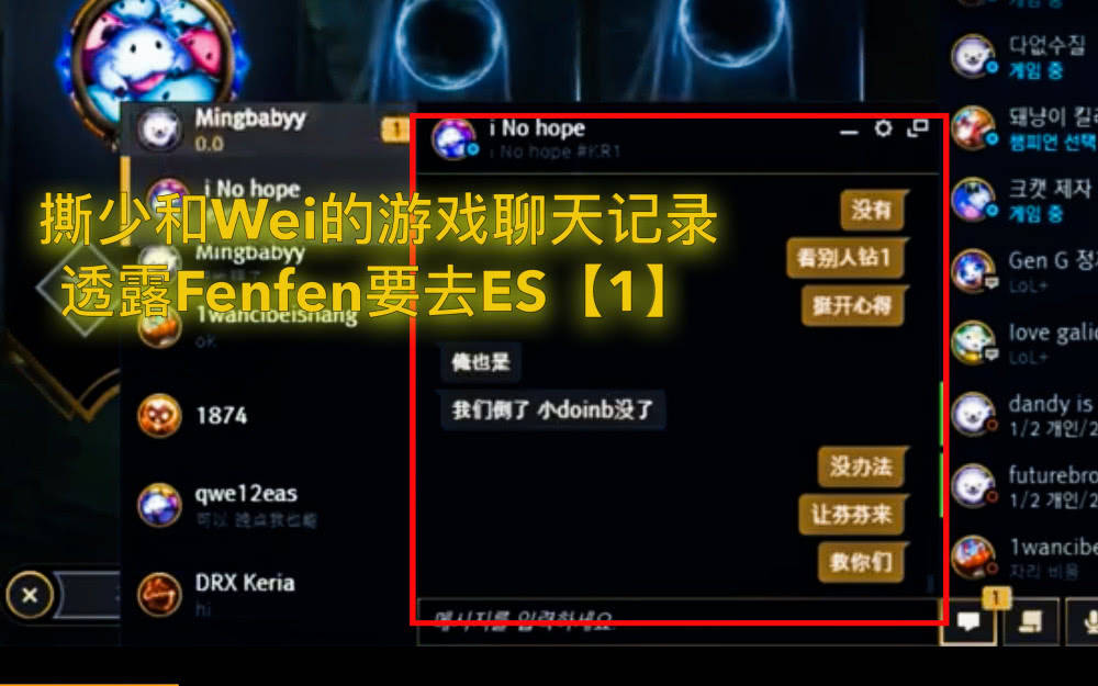 Wei说自己这边的小doinb没了,也就是说原中单Cryin离队了,这个消息本来已经让直播间的观众很惊讶,没想到撕少很淡定地表示可以让Fenfen救ES,表示Fenfen可以担当ES的大任,而且Wei也顺势和撕少聊起了Fenfen,并没有否认。ES的原中单Cryin离队也是闹得沸沸扬扬,ES经理翼风近期在社交媒体上发布了一段话:有些事总是那么无可奈何,加上Cryin总和LNG的人rank,所以Cryin极有可能加入LNG战队。由于这二人对话的信息量太大,很多观众怀疑这个“i No hope”究竟是不是Wei,经过查证,这确实是Wei的游戏账号!