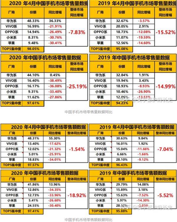 所有品牌中,华为及荣耀系表现亮眼,4月份的销量同比大涨36.33%,销售额大涨55.3%,是几家厂商中唯一正增长的,小米系、OPPO系、vivo系、苹果在4月份销量与销售额依然大幅下滑17%-30%。而整个2020年的1-4月份中,华为+荣耀销量依然增长了0.45%,销售额增长了13.96%,而其他四大阵营下滑了30%左右。
