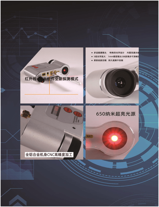 殊波长和频率的光束,使用者手持探测仪,眼睛靠近目镜进行观测,当发射器所发射