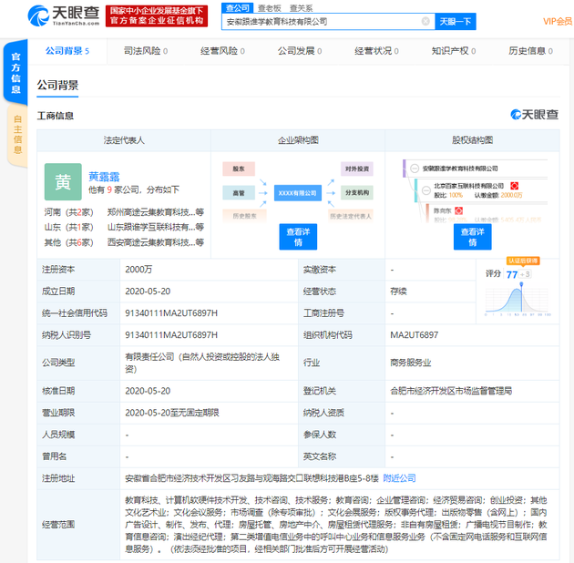 5月22日下午消息,天眼查数据显示,5月20日,安徽跟谁学教育科技有限公司成立,公司注册资本2000万,法定代表人为黄露露,公司经营范围包括教育科技、计算机软硬件技术开发、技术咨询、技术服务;教育咨询;教育信息咨询等,该公司由跟谁学的关联公司北京百家互联科技有限公司全资控股。