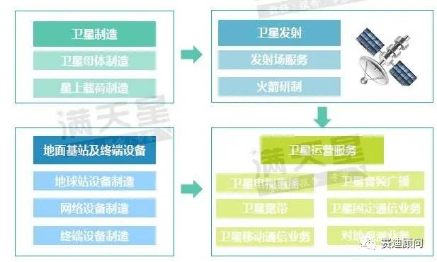 卫星制造包括卫星母体制造、星上载荷制造,其中星上载荷主要包括执行特定卫星任务的仪器、设备或分系统等。卫星发射服务主要包括发射场服务和火箭研制两部分。地面基站及终端设备主要包括地球站设备制造、网络设备制造、终端设备制造。卫星运营服务主要包括卫星电视直播、卫星音频广播、卫星宽带、卫星固定通信业务、卫星移动通信业务、对地观测业务等。