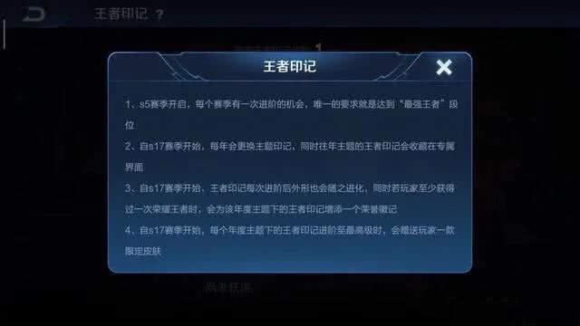 在之前的赛季更新时就有提到过,S17赛季起王者印记系统发生了改变,玩家每个赛季到达王者后都会作为一次累计,当然升级的印记并不是为了好看,而是对近几个赛季一直有王者水平的玩家做一次统计,并且当印记累计到达4次最高后,也就是最快s20赛季后,就可以出了赛季限定外再额外获得一款“王者限定”这个限定就很有排面了,要知道游戏中总共的王者玩家就没多少,更别说连续四个赛季都拿到了印记。