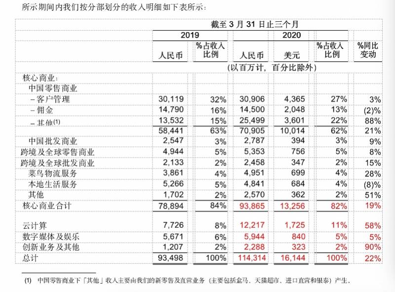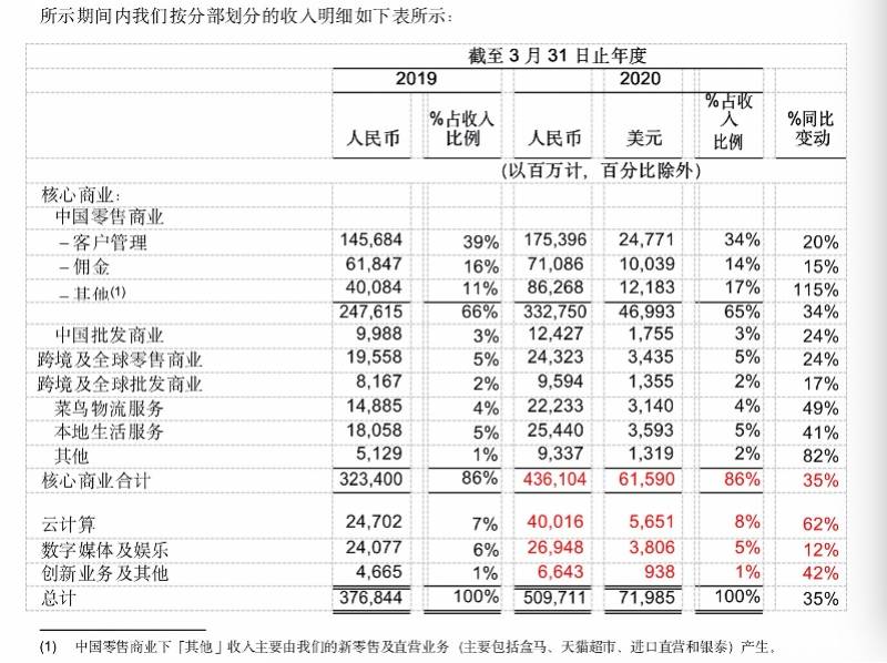 财报指出2020财年收入实现35%的强势增长主要来自于中国零售商业业务及云计算的强劲收入增长所驱动。
