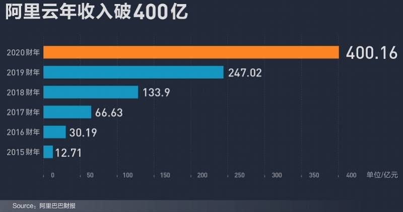 2020财年来自云计算业务的收入为人民币400.16亿元,同比增长62%,占总收入比例为8%,已成长为阿里巴巴的第二大收入板块。财报指出增长主要由于来自公共云及混合云业务的收入贡献均实现增长。