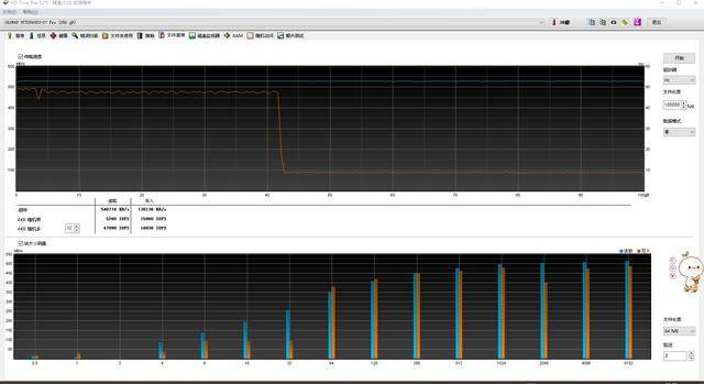 HD TUNE Pro来测试缓外性能,前期写入速度稳定,到了42-43G左右开始掉速,掉到了97-99MB/s之间,直到测试结束。