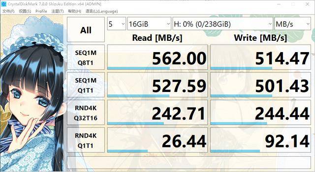 CrystalDiskMark,测试结果如图,读取速度562MB/s,写入速度大于514.47MB/s。