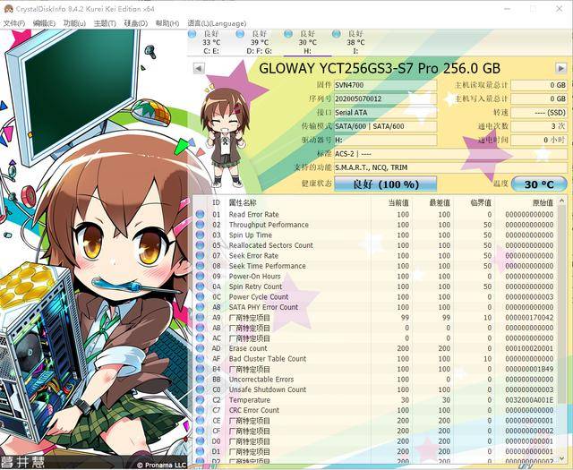 安装好了固态之后,那么我们就先用CrystalDiskInfo查看了弈系列PRO固态硬盘256GB的状态,通电次数和时间基本为0,次数3次。