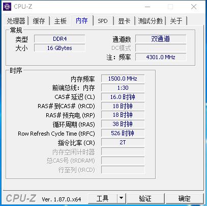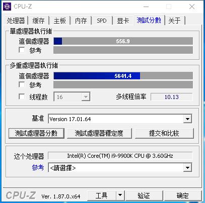 CPU-Z测试,此时内存频率3000,双通道。时序是CL:16-18-18-38。测试分数是5641.4。