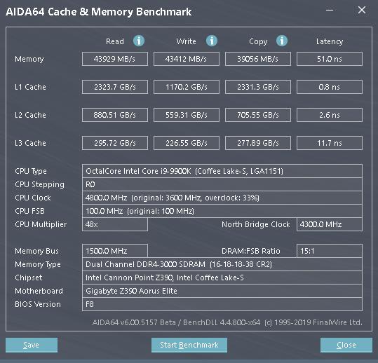 跑AIDA的内存测试,读取43929MB/s,写入43412MB/s,复制39056MB/s,延迟51.0ns 。