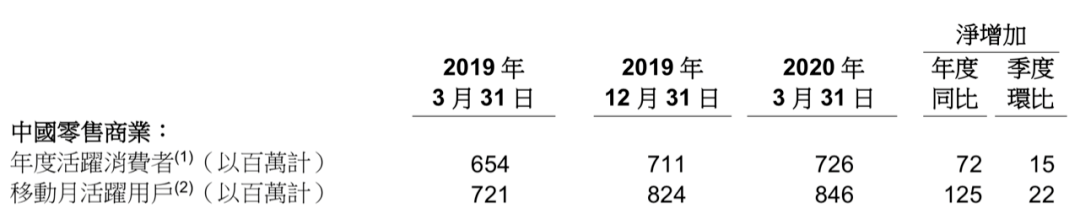 财报显示,截至3月31日,阿里巴巴中国零售市场年度活跃用户数量为7.26亿,与截至2019年12月31日的年度活跃用户数量相比增加1500万。中国零售市场移动MAU(月活跃用户)在2020年3月份达到8.46亿,比2019年12月增长了2200万。