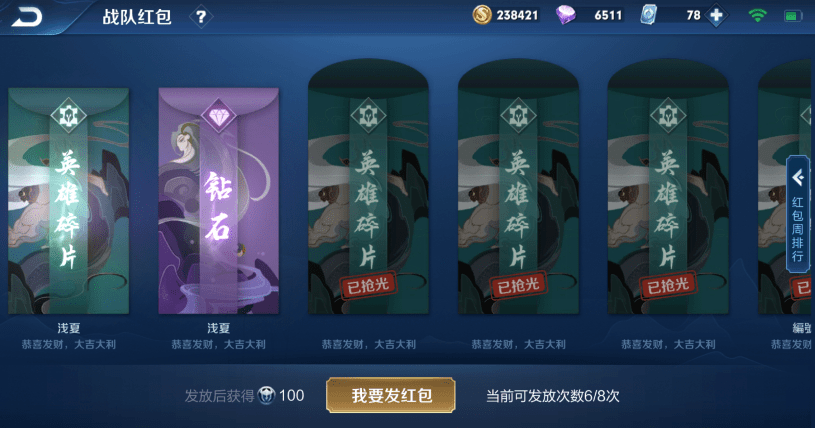 首先新手为了抢红包,这也是战队刚开设的一个板块,玩家可以在里面发各种红包,其中包括钻石,英雄碎片和皮肤碎片。因此很多新手玩家就是冲着个才加的战队,觉得可以白嫖很多道具。