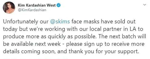 不幸的是,我们的@Skims口罩今天已经售罄,但我们正在与洛杉矶当地的合作伙伴一起尽快生产更多口罩。下一批产品将于下周发布,请尽快注册以获得更多详细信息,感谢大家的支持。