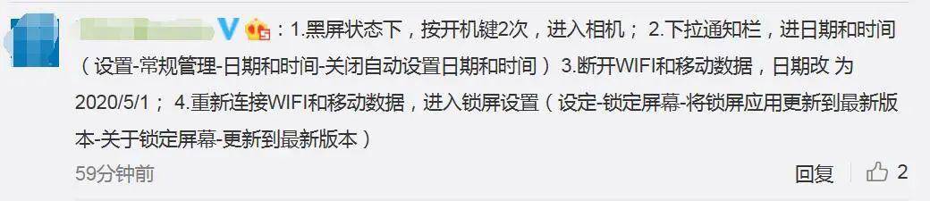 另外,一些热心网友也给大家支招如何解决黑屏。网友建议:“黑屏状态下,按开机键2次,进入相机;下拉通知栏,进日期和时间(设置-常规管理-日期和时间-关闭自动设置日期和时间) ;断开WIFI和移动数据,日期改为2020/5/1;重新连接WIFI和移动数据,进入锁屏设置(设定-锁定屏幕-将锁屏应用更新到最新版本-关于锁定屏幕-更新到最新版本) 。”