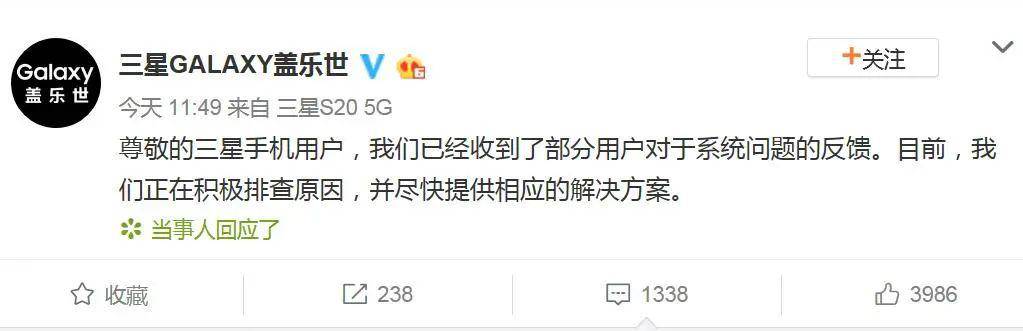 23日上午,三星GALAXY盖乐世发布微博称,尊敬的三星手机用户,我们已经收到了部分用户对于系统问题的反馈。目前,我们正在积极排查原因,并尽快提供相应的解决方案。