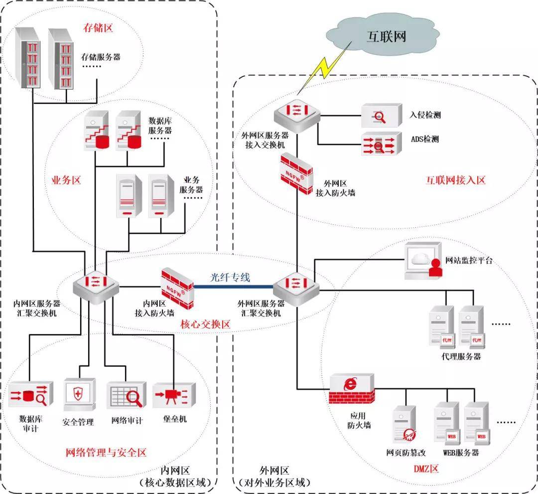 通过整体全面设计规划,从网络结构上为业务系统建立起“垂直分层、水平分区”的多层次、可扩展的安全区域 ,并在此基础上部署相应的安全防护工具手段,构建相对独立的边界访问控制体系、攻击检测预警体系、行为审计跟踪体系、数据备份恢复体系等四大技术体系,涵盖了从事前、事中和事后,以及边界、远程接入、计算环境、基础设施等全方位安全防护的纵深防御技术体系,从而提升业务系统的综合稳固性,和“可控”能力。