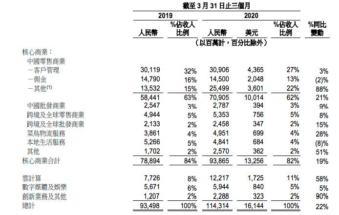 从四大业务占比营收来看,淘宝、天猫、菜鸟、饿了么、盒马鲜生、银泰、lazada等组成的核心电商仍然是创收主力。