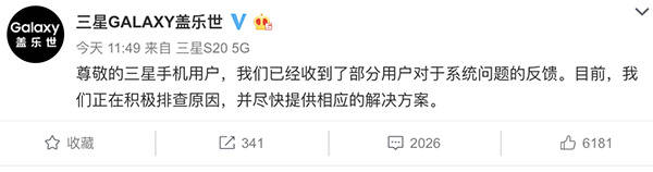 原标题:三星多型号手机遭遇黑屏、乱码、重启,三星:正积极排查原因
