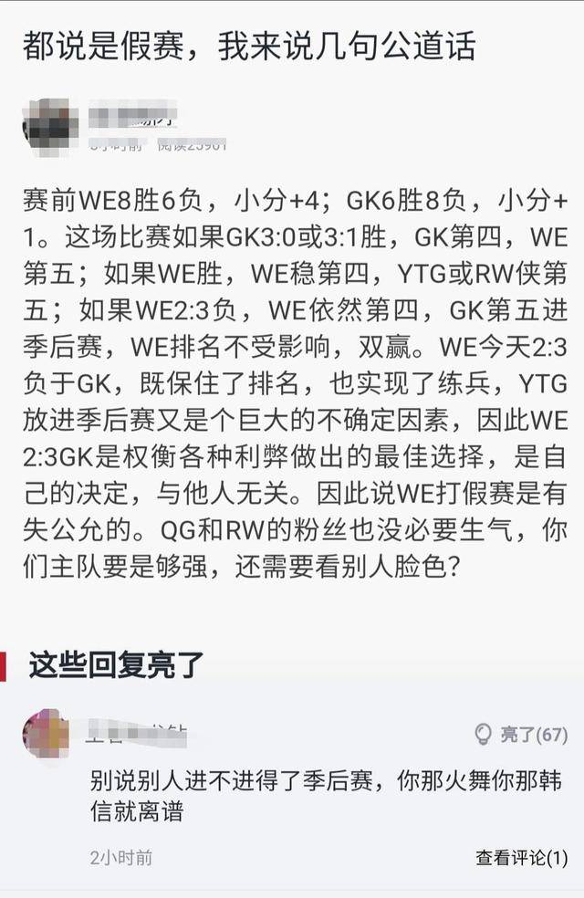 在看了比赛之后,很多人都觉得第五场原本WE战队应该赢得胜利,但怎么看像是故意输掉比赛的,所以大家都开始质疑WE是打假赛。同时面对现在KPL所有战队的局势,也有人进行了详细分析,从积分上来看,WE战队这次即使是以2:3的成绩输掉比赛,也可以稳居第四,那么进季后赛也是稳了,而且GK也可以进入季后赛。从这方面分析自然会有人觉得WE战队是在打假赛。